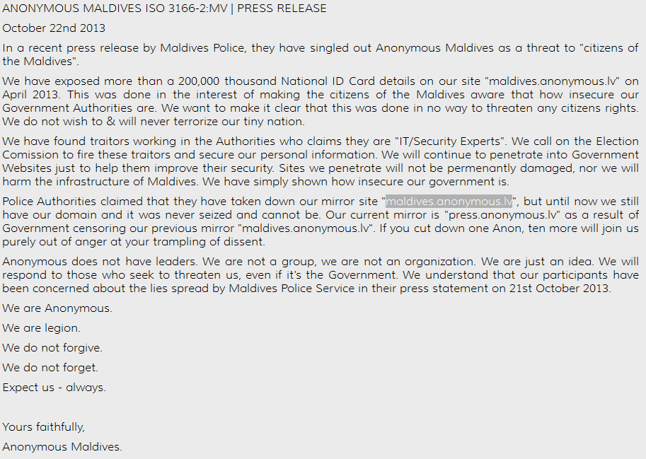 anonymous لا يملك القادة. نحن لسنا مجموعة، نحن لسنا منظمة. نحن مجرد فكرة. وسوف نرد على أولئك الذين يسعون إلى تهددنا، حتى لو كان الحكومة. ونحن نفهم أن المشاركين لدينا تشعر بالقلق إزاء الأكاذيب التي تنشرها دائرة الشرطة في جزر المالديف في تصريح صحفي على 21 أكتوبر 2013.